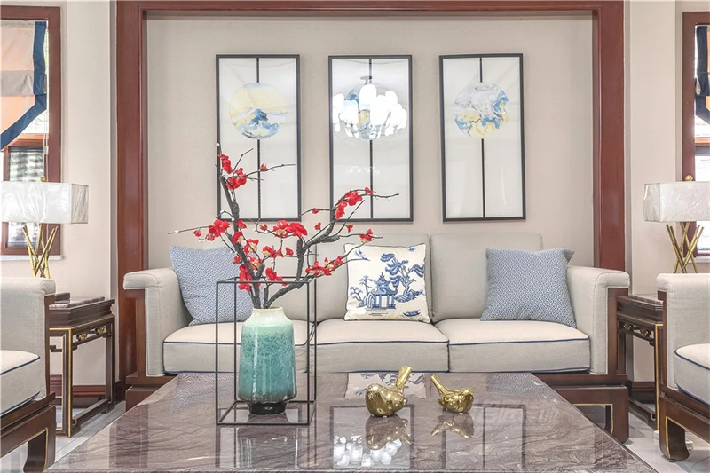 布局方正的布藝沙發(fā)簡(jiǎn)雅端莊,別具大宅之家的氣韻,呼朋喚友齊聚一堂,客廳氛圍自然輕松又舒適。