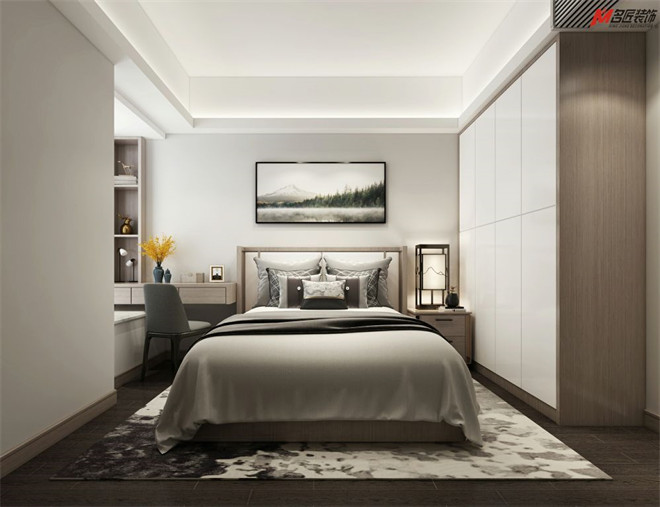 臥室采用灰調元素緊跟現(xiàn)代時尚潮流,將現(xiàn)代風展現(xiàn)的淋漓盡致,房間的中央地毯跟整體色調相協(xié)調,既配合了主題,使其不止有唯美的感覺。反襯白色背景和原木紋肌理線條清秀而素雅,與靜謐灰調、床上用品的氛圍相融,在簡約中展現(xiàn)藝術的氣息。