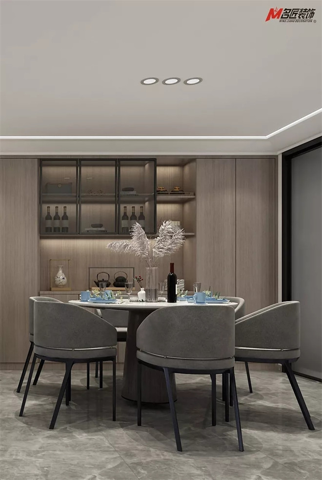 客餐廳互為一體的融合關系,最大限度地利用了光源,在轉瞬即逝的光影變化中體驗材料的細節(jié)之處。原木紋墻柜、大理石餐桌、時尚餐椅、簡約風射燈,舒適的令人對每日三餐充滿向往和期待。