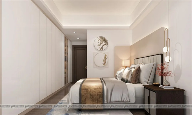 主臥的設(shè)計整體留白。嵌入式衣柜美觀實用,原木色和純白色的相遇,烘托出空間的溫潤,床頭墻用啞光烤漆木飾面作為裝飾,保持風(fēng)格一致,與細(xì)膩的軟裝陳設(shè)交相呼應(yīng),予人入室的舒適愜意享受。