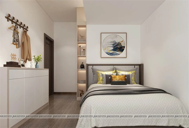 長輩房的設(shè)計延續(xù)整體風(fēng)格的清幽淡雅,床頭墻掛著的飛鳥山水圖色彩鮮明大氣,與枕頭顏色協(xié)調(diào)照應(yīng),為素凈的居室環(huán)境帶來一絲靈動。
