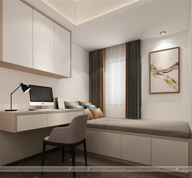 次臥的面積不大,設(shè)計師選用了衣柜書桌一體化功能設(shè)計,除了能夠節(jié)約空間,又滿足了工作、儲物等需求。