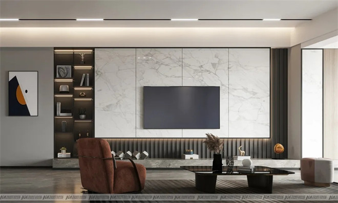 客廳的設(shè)計極具匠心,設(shè)計師通過不同材質(zhì)的替換拼接及色彩搭配,為整個空間定下了精致優(yōu)雅的基調(diào)賓利橙+高級灰的經(jīng)典搭配,將時髦感與奢雅感引爆,撩動心弦。