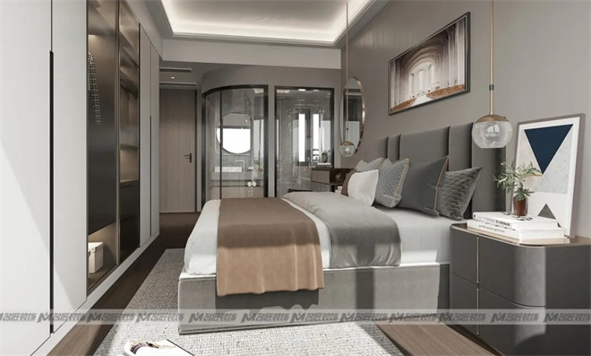 主臥低飽和的配色方式,再輔以金屬色的軟裝點(diǎn)綴,賦予空間深邃感及和諧感,宜家更宜居,還有一個亮點(diǎn)是全玻璃的衛(wèi)生間設(shè)計,既節(jié)省空間又增加透光度,采用玻璃隔斷將沐浴區(qū)與梳洗區(qū)、如廁區(qū)分開,做好干濕分離
