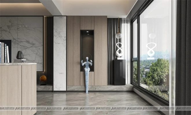 進(jìn)入玄關(guān),已然感受到彌漫在空間里的現(xiàn)代輕奢感,造型獨(dú)特的人物雕塑及藝術(shù)性擺件,使玄關(guān)的設(shè)計感更加充盈