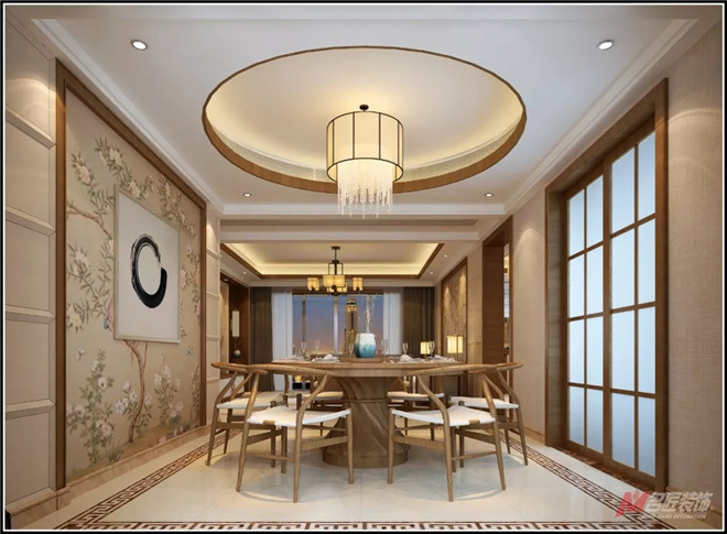 餐廳設(shè)計(jì)延續(xù)了“中國(guó)圓”的概念,圓桌設(shè)計(jì)與圓形吊頂相呼應(yīng),同時(shí)體現(xiàn)了空間的層次美與中國(guó)傳統(tǒng)文化的圓滿之意。