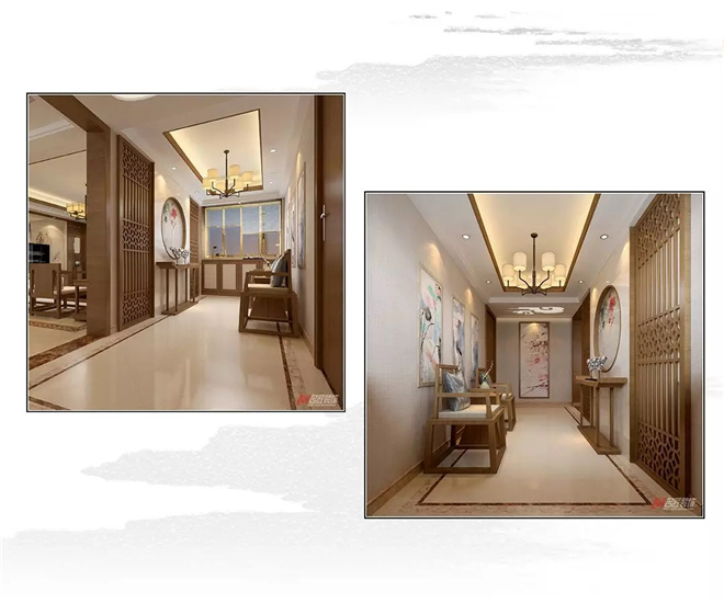 從玄關(guān)處便可以感受到濃濃的中式韻味,古雅的原木色調(diào)桌椅、花鳥魚蟲的水墨紋樣,入戶面積不大的空間,卻通過中國(guó)傳統(tǒng)藝術(shù),營(yíng)造出古樸秀雅、落落大方的古典氣質(zhì)