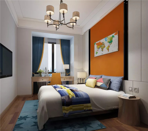 小孩房靠窗戶設置書桌,光線充足;整體以白色調為主,搭配橙色背景墻與深藍色窗簾,讓空間更有活力。