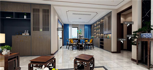 。除了保留中式的韻味外,還加了大理石、燈帶等材料,使空間包含現代生活氣息。新中式風格是一種既繼承了中國古典園林的基本元素及造園手法,又融合了現代簡約的幾何圖案及線條的設計風格