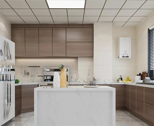 采用硬朗簡潔的直線條,使空間具有層次感;家具顏色以深色為主,蘊含深厚沉穩(wěn)的底蘊,搭配木質櫥柜與大理石石紋瓷磚,呈現出簡雅低沉的氣質,整體設計兼具觀賞與實用性。