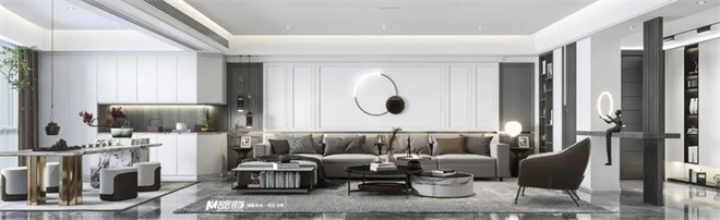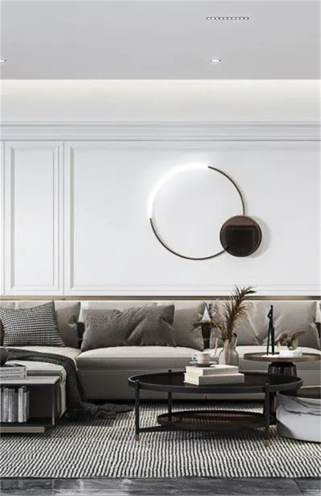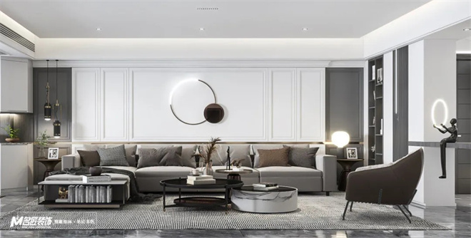 客廳黑白灰為主色調(diào),使得整體空間產(chǎn)生豐富的層次感,適當(dāng)?shù)牧舭?,在這種現(xiàn)代美學(xué)的基礎(chǔ)上進(jìn)行藝術(shù)化的改造。